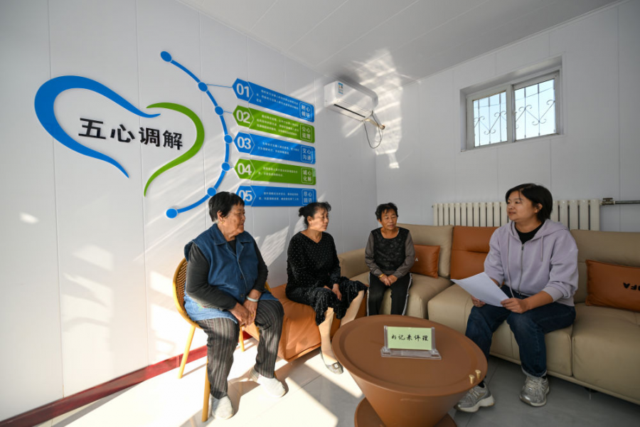 在天津市宁河区芦台街道金华路社区,社区党总支副书记吴蕊(右一)就社区监控设备安装问题为社区居民进行解答(2024年10月11日摄)。金华路社区积极践行新时代“枫桥经验”,将原社区居委会闲置用地提升改造成为联络群众的基层综合治理阵地——“解铃小院”。新华社记者 孙凡越 摄